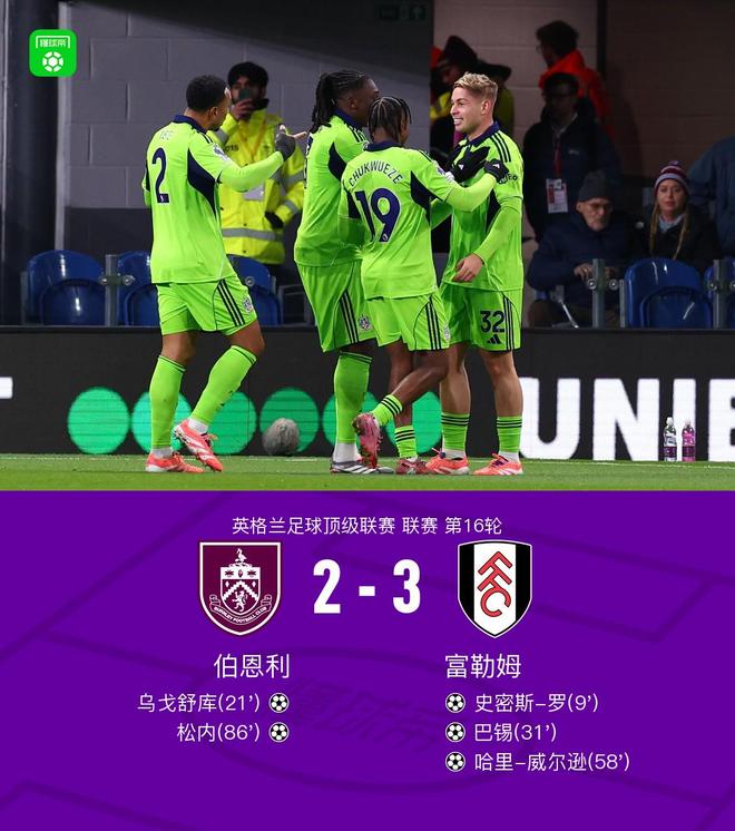 富勒姆客場(chǎng)3-2伯恩利,哈里-威爾遜兩傳一射,史密斯-羅建功